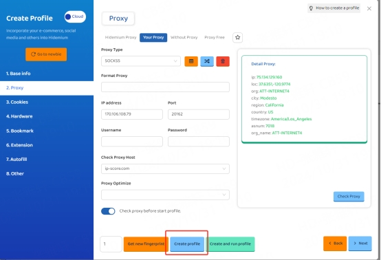 5. After the settings are completed, click the "Create profile" button at the bottom of the window to save the profile settings.