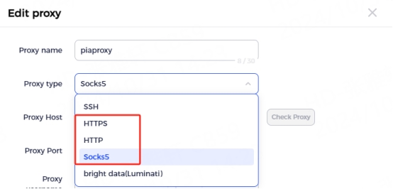 2. In the "Proxy Type" section, press the drop-down menu and select HTTPS, HTTP, or Socks5 protocol