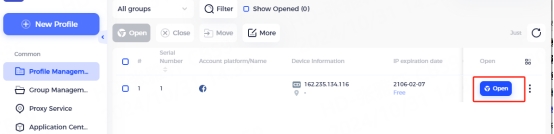 9. In the "Profile Management" tab, you will see the profile you created. Press the "Open" button to start the browser profile.