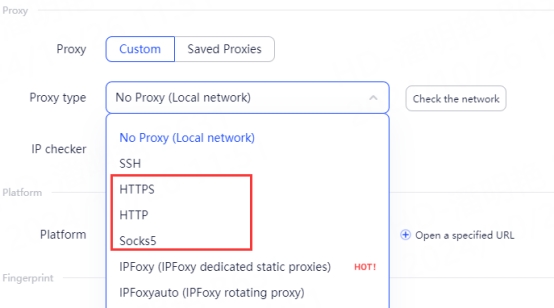 2. In the "Proxy Type" section, press the drop-down menu and select HTTPS, HTTP, or Socks5 protocol