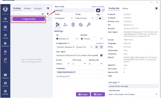 5. After the settings are completed, click the "Create" button at the bottom of the window to save the profile settings.