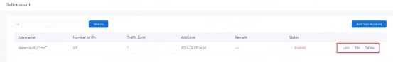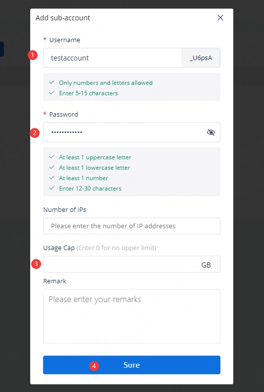 You need to assign a username, password, and the maximum number of IPs and traffic limits that can be used to the subaccount. Once completed, click "OK"