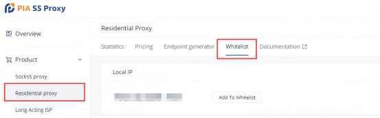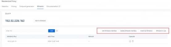 You can manage whitelisted IPs by clicking the "Residential Proxy-Whitelist" tab.