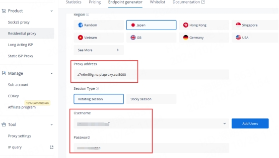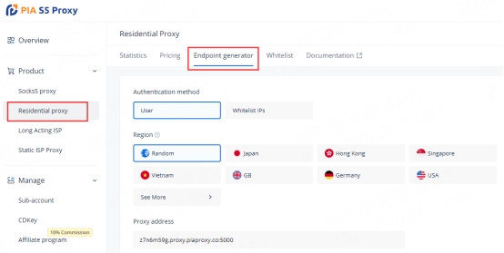 If you have already purchased a residential proxy, you can get the proxy IP in the Residential Proxy-Endpoint Generator section of the Personal Center