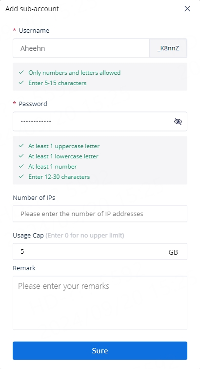 4. Enter the maximum number of IP addresses and traffic limit that the sub-account can use, and finally click Save