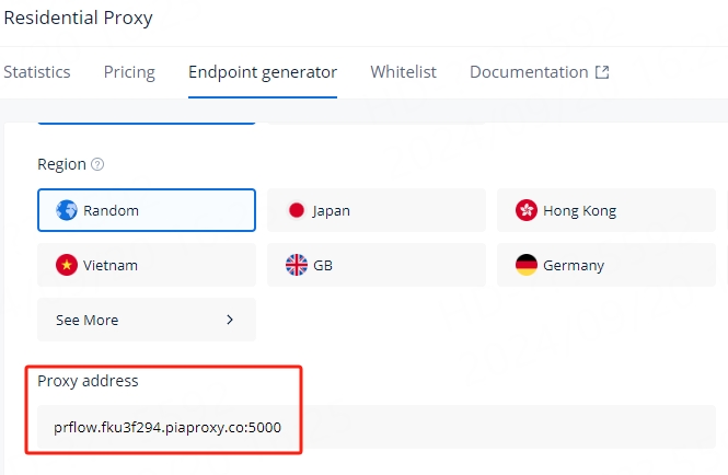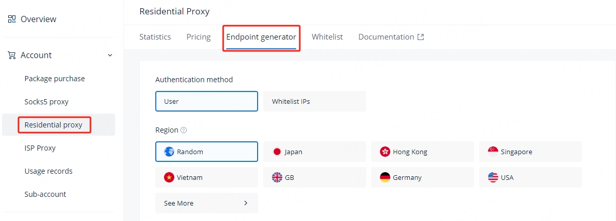5. Click Residential Proxy, click Endpoint Generator, select User for authentication method, and then select the proxy region you want to use.