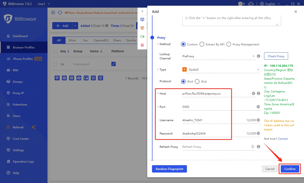 2. Select PiaProxy as the IP query channel, select Socks5 as the proxy type, copy the proxy address and port, add the sub-account username and password just set, and finally click Proxy Detection. After the test is successful, Just save