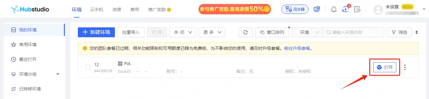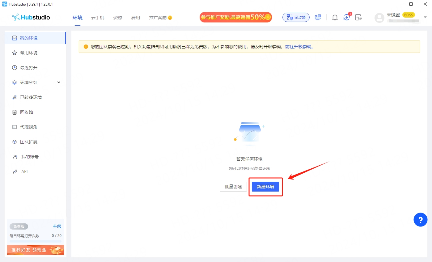 1. Open the Hubstudio browser, after logging in, click New Environment