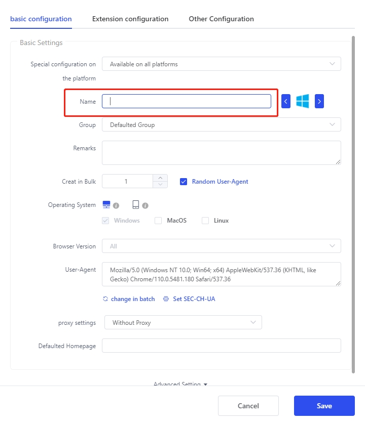 2. Enter the basic configuration, enter a name