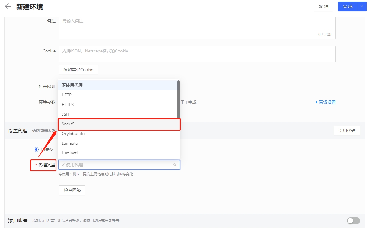5. Proxy type selection Socks5