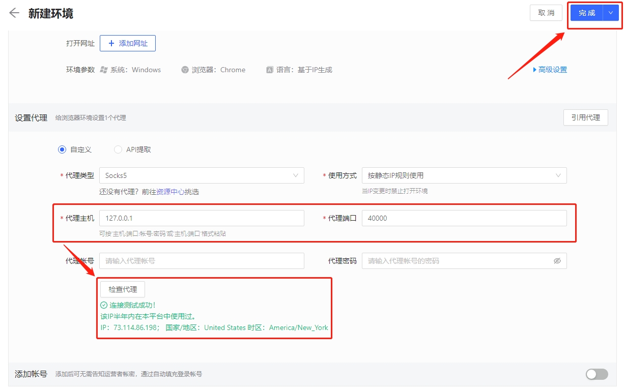 6. Paste the proxy IP and port you copied just now, and click "Check Proxy". After the check is complete, click "Finish"