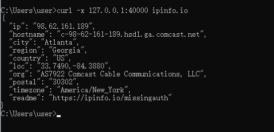 2.3測試命令:curl -x 127.0.0.1:40000 ipinfo.io