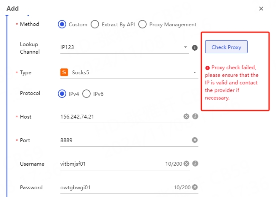 假設妳的提取的代理是156.242.74.20:8889不可用