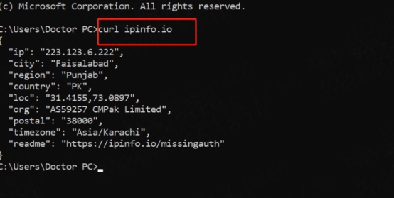 輸入檢測命令時,顯示當地IP,城市,國家等,說明代理正常