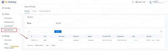 登錄後,前往“個人中心”頁面,找到您購買的靜態ISP代理,確保記錄了以下信息:IP、Port、Username、Password