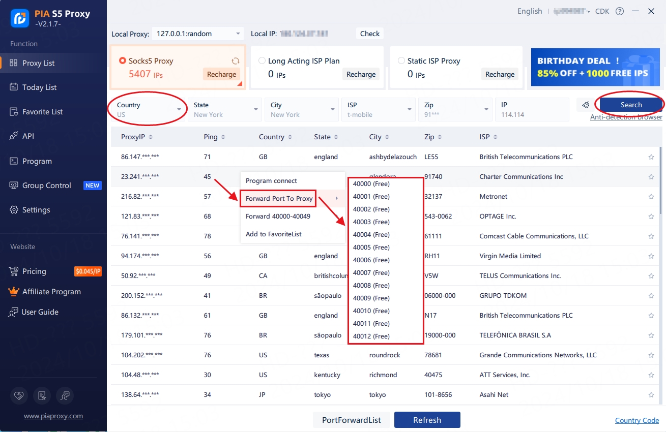 1. 選擇國家、洲、城市後,點選「搜尋」按鈕,然後右鍵選擇代理IP和端口