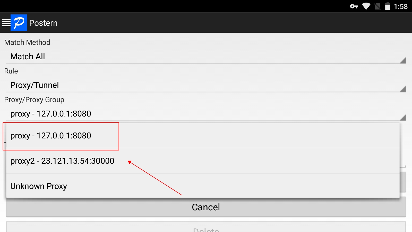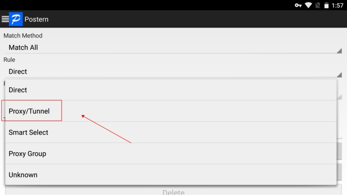 10. 打開 Rule 選項,選擇 Proxy/Tunnel,然後選擇剛才保存的 IP。